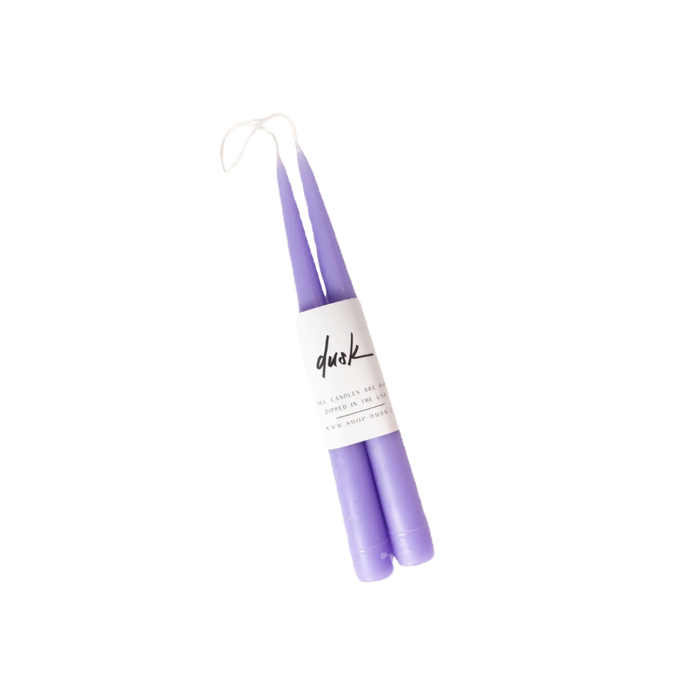Hand dipped 9 inch inch long taper candle stick set (connected by the wick). Dusk's tapers are made with a blend of beeswax, other premium waxes and dyes to create a rainbow of hues, all in the USA.